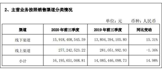 不过,值得注意的是,今年的疫情对于线上渠道的促进并没有发生在海天味业身上。前三季度经营数据显示,海天味业的线上渠道收入反而下滑了1.36%至2.77亿元,占比降低至1.74%。